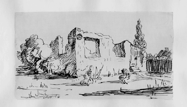 Кирха под берёзами на развалинах храма Святовита. Рисунок автора. Конечно нет там никакого коловорота - я его разместил чтобы придать изначальный смысл данному месту. Июль, 2019г.("Путешествие на остров Буян") |
