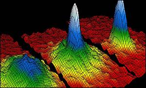 Американцы Корнелл (Национальный институт стандартов и технологий, Колорадо) и Вейман (Университет Колорадо) создали конденсат из 2 тысяч атомов щелочного металла рубидия, охлажденных до 20 нК (это всего на 0,00000002 градуса выше абсолютного нуля - -273,15 градуса Цельсия или 0 по Кельвину). Независимо от них немецкий физик Вольфганг Кеттерль (он работает в Массачусетском технологическом институте) проделал такой же эксперимент с атомом натрия. Более того, ему удалось доказать, что два независимо полученных конденсата одного и того же металла полностью одинаковы.