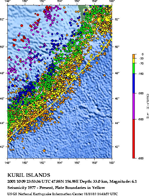 Землетрясение на Курилах c магнитудой 6.1 Сильной землетрясение произошло во фронте Курильской дуги 9 октября в 23:53:36 по UTC в районе с координатами 47.88 с.ш. с 154.98 в.д. Очаг располагался на глубине 15 км. Этот район малообитаем и расположен более чем в 600 км от г.Курильск.  На рис. глубина определена в 33 км, но это предварительные данные, связаные с неточностью измерений на большом удалении, более точные данные см. ниже.