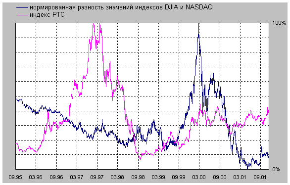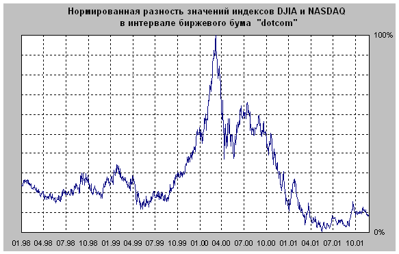 Смысл: экстраполяции настоящего в будущее далеко не всегда оправданы, хотя во всех случаях освящены авторитетом математики. Но это уже вопрос научной этики, хотя и занимательный в части, например, рыночных приложений, но все же не основной для нас. Основное для нас состоит вот в чем. Если созданная в 1998 году программа "Mark III" и вправду неверна, то с тех пор она должна была накопить коллекцию неудач не только для развивающихся стран (Россия-1998, Турция-2000, Аргентина-2001), но и для основного, так сказать, контингента - тех, ради благополучия которых, собственно, создавался МВФ. Такие примеры есть. Рассмотрим, в частности, ситуацию с мыльным пузырем NASDAQ . Вот как выглядела история " высокотехнологического пузыря " на фоне общего развития национальной экономики, отражаемого поведением индекса Доу-Джонса (рис.1).