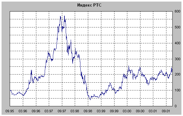 В России к моменту старта мыльного пузыря dotcom как раз завершился процесс, который в соответствии с национальной традицией именуется не пузырем, а пирамидой. Вот как выглядела история крупнейшей в истории нашей страны пирамиды, отражаемая в поведении биржевого индекса российской торговой системы (рис.2).