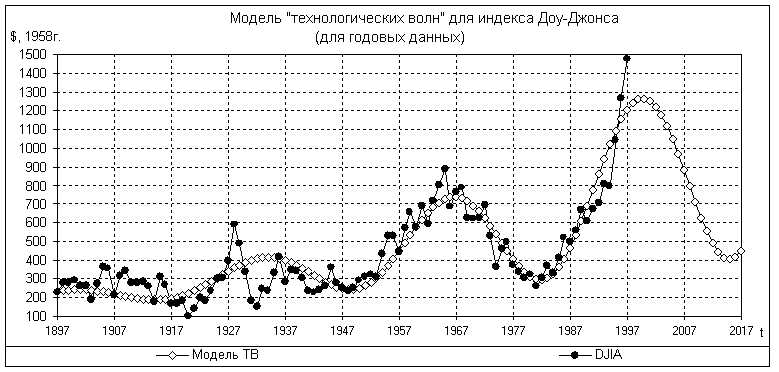 Собственно, гипотезу о причинах такой недальновидности мы уже изложили выше. А теперь законный вопрос: чего же не учли многомудрые создатели эконометрических моделей? Даже оставаясь в рамках имитационной модели, им стоило бы уделить больше внимания инновационному циклу. И тут мы снова возвращаемся к фактору универсальной природы человека. Вне зависимости от характера инновации и масштабов экономической деятельности человека в конкретную эпоху, чисто психологические и интеллектуальные препятствия на пути овладения принципиальными инновациями, будь то огонь, колесо, плуг, алфавит, порох или компьютер, для конкретных людей остаются практически теми же. Распространение принципиальных инноваций в социальной среде невозможно сделать более скорым, равно как нельзя его и затормозить. Жизненный цикл идеи приблизительно постоянен, т.к. зависит от психологии масс, а не свойств собственно инновации. Данный социальный инвариант давно известен в экономике, наряду с другими бизнес-циклами, которыми он зачастую маскируется. Наиболее продолжительной статистикой обладает, как известно, индекс Доу-Джонса . Выделенный в нем циклический тренд, отвечающий предположению постоянства его периода и приведенный к масштабу цен, отвечающему середине рассматриваемого интервала (1958-й год), имеет следующий вид (рис.4).