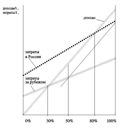 Чтобы дать такое обоснование, рассмотрим график финансового состояния среднестатистического предприятия за рубежом и в более жестких природно-климатических условиях России. По горизонтальной оси на этом графике отложена величина уровня загруженности предприятия в процентах от максимальной загруженности, определяемой предельным объемом продукции, которое в состоянии производить предприятие в единицу времени. По вертикальной оси отложен уровень затрат и доходов предприятия также в единицу времени.