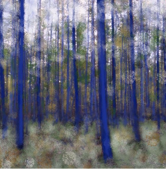 Синяя осень. В чём претензия на стиль в этой картинке? – В том, что тут как бы наложены друг на друга два плана: дальний - с обычным пейзажем и ближний, как бы фото, пропущенное через светофильтр, придающий тёмным вообще-то стволам синее сияние. Но только как бы: почти крайнее справа дерево прорвалось мимо светофильтра. Другая особенность: есть слой в изображении (самый первый и очень тонкий), который несёт на себе серо-белые пятна в основном внизу кадра и вверху его. Механистичность чувствуется. Подозреваю, что исполнено компьютерной графикой. Или человек притворялся компьютером. Вот ему программа: обозревая слева направо стволы толщиной от и до такой-то ширины при встрече с каждым очередным стволом заданной ширины ляпать ярко-синюю прямую, шириной чуть меньше, чем ствол. В конце надоело это - и последний ствол не обляпан. А серо-белые пятна набрызганы из пульверизатора. Какой-то не очень умный человек “творил”. Но на первый, поверхностный взгляд (как на импрессионизм смотрят) – впечатляет. Я клюнул.