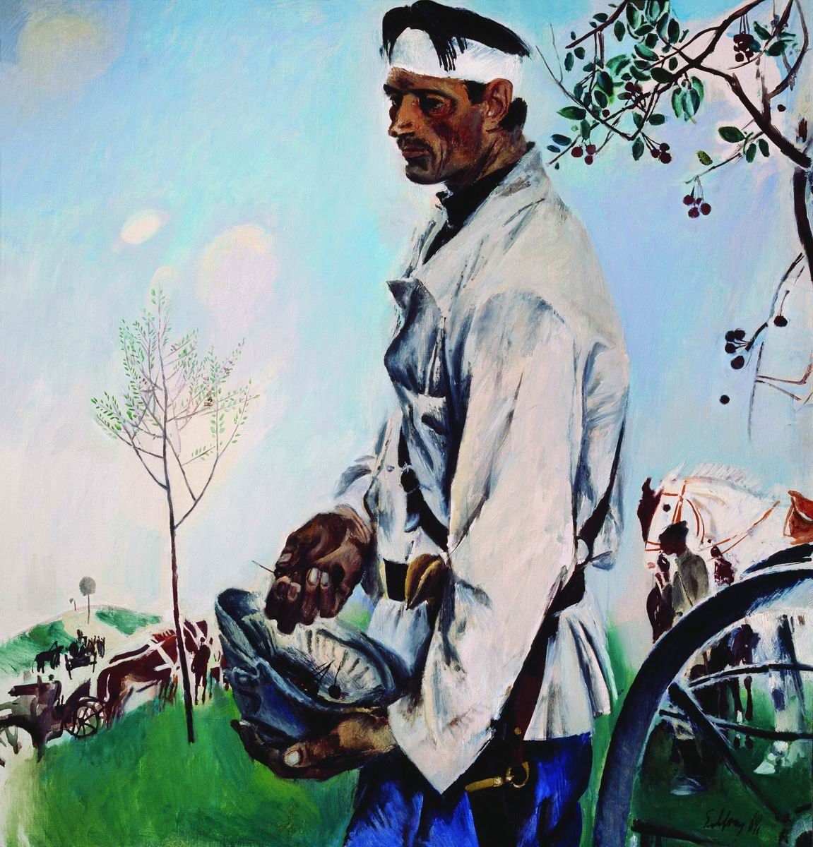 Моисеенко. Призыв. Название “Призыв” ассоциируется с призывом в Красную Армию мужского населения тех мест, которые освобождены от белых. Это травма для женского населения. И вот мы видим, как отчаивающиеся женщины бегут по двум дорогам, на перекрестии которых собралось перед походом на фронт новонабранное войско. Они бегут, заламывают руки и плачут, как по уже убитым на войне. А тем пока всего только скомандовали строиться (рука командира пуста). Ну и надо ли обращать внимание, как нарисована эта рука, с каким корёжением натуроподобия. Как ненатурально белы будёновки. Как не по-настоящему рдеет щека юного командира. Как безлики красноармейцы. Как уже исчезают их (и командира) фигуры на белом фоне, символе небытия. Какое противоестественное облако громоздится в небе. Даты создания картины не нашёл. Но это точно послевоенное время, когда коммунисты, их верха, вступили на путь предательства коммунизма. 17 сентября 2023 г. Не без сюжетного противоречия и такая картина.