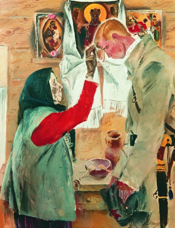 Моисеенко. Сын. 1969. Холст, масло. "С древних времён в крестьянском быту до 20-х годов ХХ в. основным столовым прибором была деревянная ложка” (https://infourok.ru/prezentaciya-iz-istorii-zhizni-lozhki-1670238.html). Вот две их и изображены внизу картины. Чтоб зритель знал, что показано время гражданской войны. Ибо будёновки (её держит в руках красноармеец) отменены были в РККА только летом 1940 года. Потому и так много икон на стене, что антирелигиозная пропаганда не успела ещё проникнуть вот в этот крестьянский дом. Но вообще, это противоречие для 60-х годов: иконы и красноармеец, которого мать крестит. Его ввести Моисеенко нужно было по уже выявленной причине: оппозиционности художника лжесоциализму, построенному в СССР, который никакая хрущёвская оттепель не вылечила. А последующая эпоха – тем паче. Ну неприкрытое экспрессионистское “фэ” сему выражено этой серостью на щеках старухи, чернотой её рук, багровостью лица солдата и коричневостью его рук, нелепой алостью рубашки матери и примитивизмом исполнения её (без складок) и т.д. и т.п. 24 сентября 2023 г.