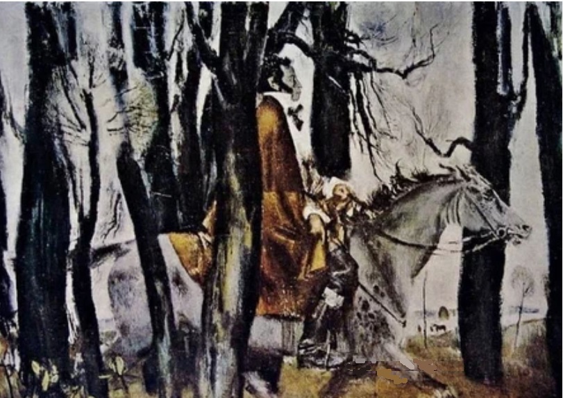 Это открывает дорогу экспрессиноистскому корёжению натуроподобия, выразителю крайнего разочарования в своём времени, так называемого развитого социализма. - Осенние листья выглядят, как булыжники. Туман, скрывающий низ ног коня, не стелется дальше места пребывания этого коня: конь вдали виден весь. В то же время всё небо затянуто непроницаемым туманом.