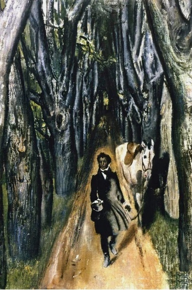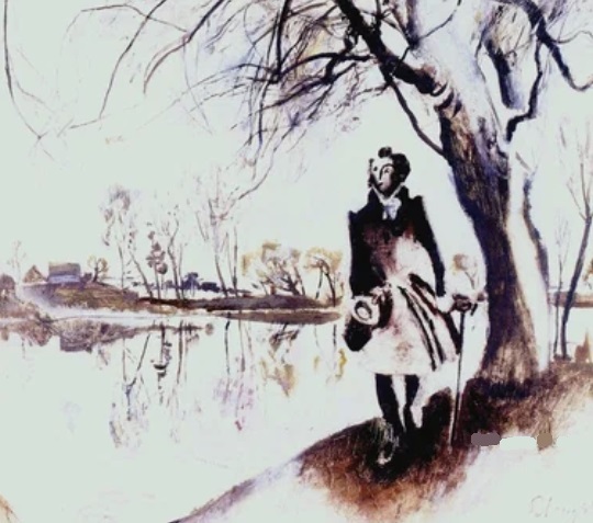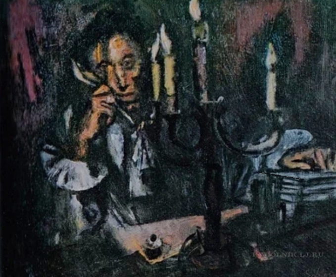 Спускающая целую свору экспрессионистских “фэ” времени создания вещи. Тут и немыслимые белые блики на сюртуке Пушкина, его тёмных штанах, полях чёрной шляпы, дереве, траве на переднем плане, и ужасная тень на правой пушкинской щеке.