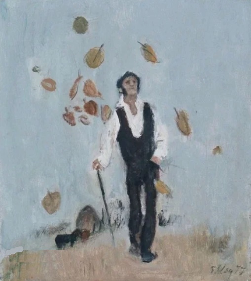 В этой вещи Моисеенко посмеялся над совком не как “в лоб” не замечающим ничего подозрительного, хоть мог бы заметить (что режется лес – и воля-свобода, общий оптимизм поэзии – и изображённое настроение, реализм – и парение над землёй). Здесь изображено то, каким Пушкина себе представляют совсем далёкие от поэзии люди (какими и были большинство совков). Они слышали какой-то звон, что Пушкину предсказали смерть от белого человека, а Дантес был блондином. И всё. – Ну кто мог предсказать? – Наверно, цыганка. – И Моисеенко рисует цыганку. С характерно повязанным платком на голове и другим – на спине.
