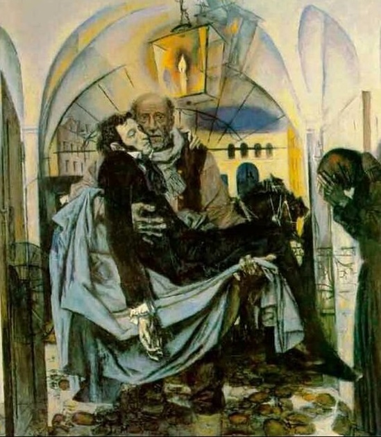 Но под ударом экстремиста-экспрессиониста Моисеенко находится именно гуманизм. Которому привержен был и совок, как к буржуазному (пусть и лживо-пропагандистскому по сути) явлению. Да, отчаяние от ухода перспективы построения коммунизма в какое-то не известно, достижимое ли, сверхбудущее, превратило экспрессионизм в ингуманизм. Что и выражено в этой страшной правой ручище Никиты Козлова. Да, Моисеенко стал совконенавистником. Ибо и все советские люди через 150 лет после смерти Пушкина проявляли в общем какую-то нелитературную, а просто человеческую любовь к Пушкину, будто это близкий сосед или родственник. От потери это, если положа руку на сердце, коммунистической перспективы – к самосовершенствованию. Гуманизм и вообще то, что у или ниже пояса, - роднее оказалось.