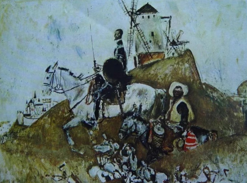 При таком толковании оправдывается ненависть к советским властителям-предателям-коммунизма, выражаемая экспрессионистским корёжением натуроподобия: невертикальностью стен, умопомрачительной крутизной улочки, невероятной вытянутостью фигуры Дон Кихота, рахитичной головой Санчо Пансы…
