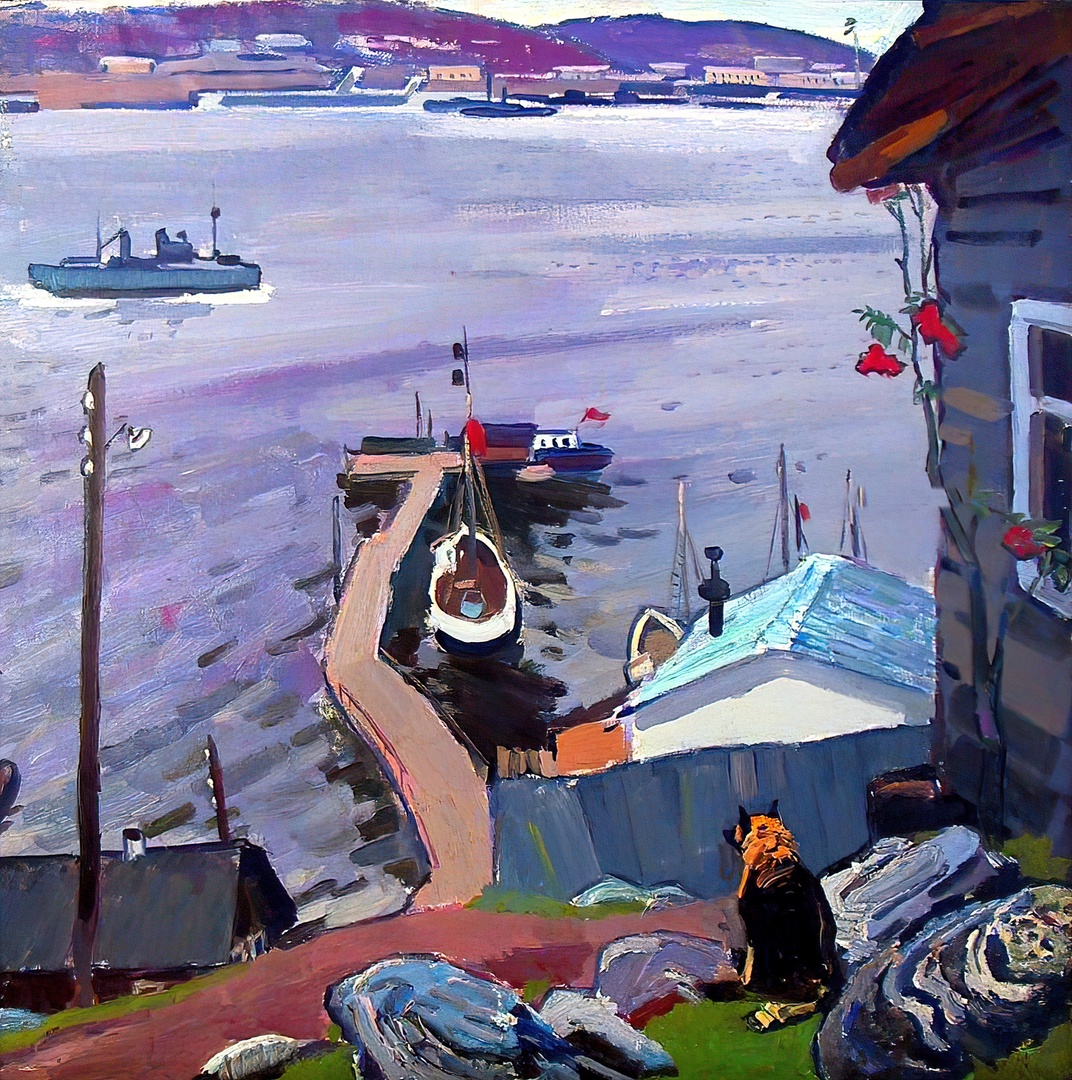 Васин. У судостроительных мастерских. Мурманск. 1965. Холст, масло. Ну да, - не знаю, как в Мурманске, - а в средней полосе бывают такие осенние дни, что всё как бы в молоке. Дымке туманной. Так разве можно цвета при этом называть локальными (в смысле – краска без примесей)? Вот эта отрезанность лица одного из рабочих, или маленькая жизнь этой девчушки на перроне в необъятной стране, отсутствие водопровода в доме или гроздь рябины, выполненная локальным, наконец, оранжевым цветом - всё это не похоже ль разве на абы какую жизнь из формулы идеостиля импрессионизма: "хвала абы какой жизни"? – Похоже. Но импрессионизм воспевает жизнь индивидуалиста, приспособившегося к жизни во враждебном общественном окружении. Щепетильная, коллективистская по идее, советская власть не зря чуралась импрессионизма. А примарное, - так его назвал Манин, - искусство? "Север в 1960-х годах превратился в российскую Мекку. Там открывали что-то чистое, старорусское, давно забытое. Художники видели русские лица, светлое небо (если не в алмазах, то без гари и дыма), устойчивый неторопливый быт, взаимоотношения людей, основанные на доверии, без которого нельзя обойтись в каждодневном нелегком труде. Иначе говоря, в северных впечатлениях художников сомкнулись нравственные устои людей и ясный облик родины - все то, что каким-то непостижимым образом сливается в понятие русской национальности с ее своеобразием и неповторимостью. Традиционное искусство власть не приветствовала, но, как ни странно, постепенно признала его только потому, что оно ориентировалось на натурную форму…” (http://www.artpanorama.su/?category=article&show=subsectiondes&id=6). Оппозиционность себе этого искусства советская власть (так называемая, ибо никакая она была не советская, а власть партноменклатуры) всё-таки терпела. Это оппозиционность видна, наверно, только в датах создания и в теме какой-то антицивилизации-комфорта. У Моне мизерная вероятность улова помещена в самый центр урбанистской цивилизации. Примирение с нею, нехорошей.