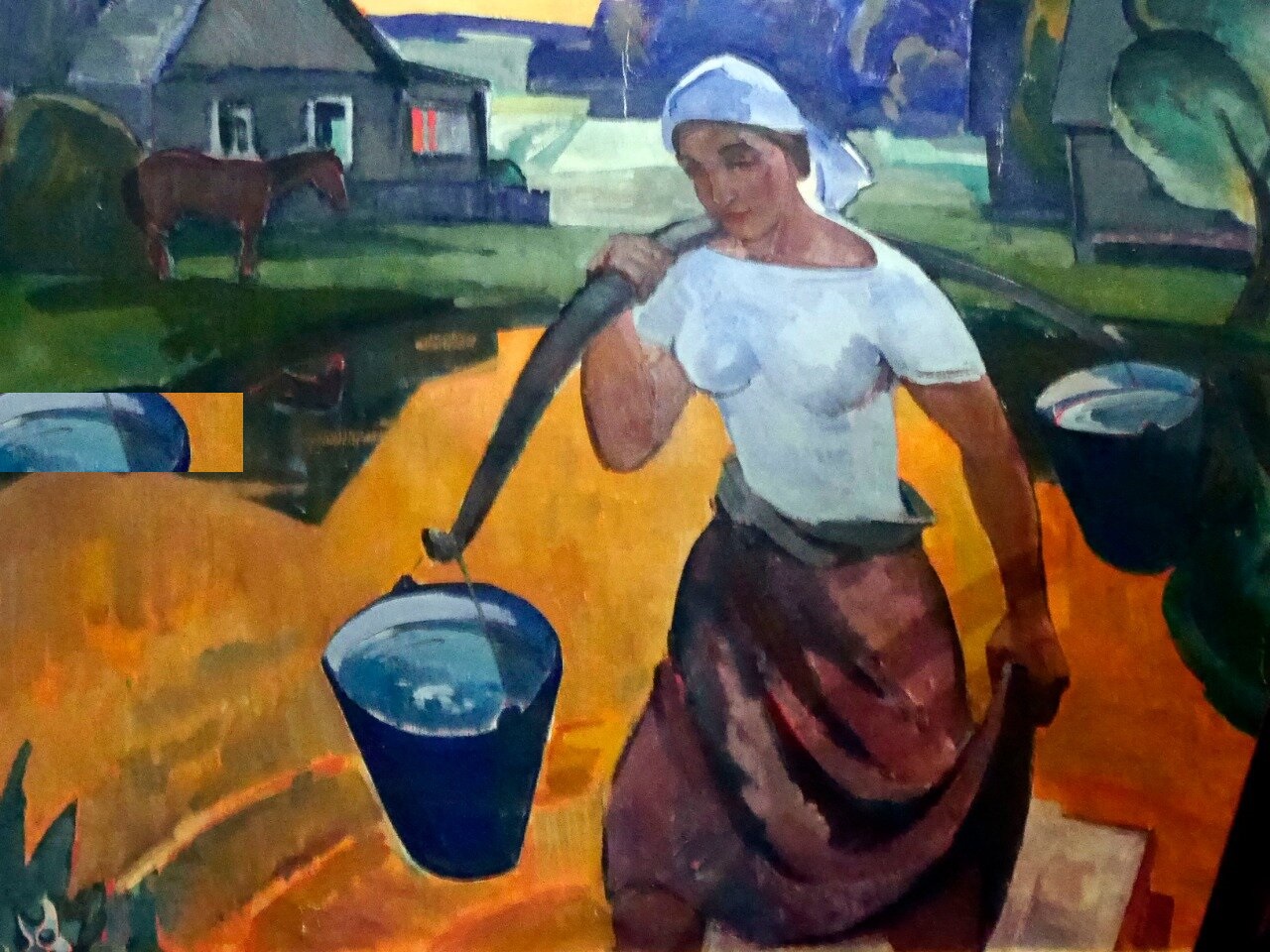 Васин. С полными вёдрами. Ну какой, к чёрту, "интерес к деталям” при таком лаконизме изображения в лице, в деревьях, в травах, в крышах, в лошади? И какая "живая жизнь героев”, когда тут жизнь дополнительных цветов: оранжевого с голубым,