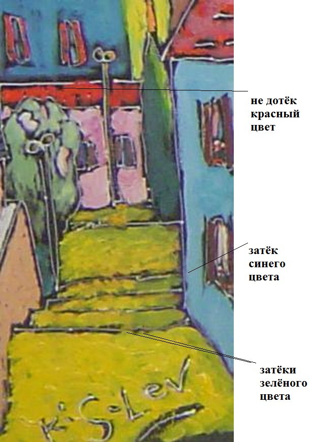 Посмотрим на зелёный. Кислеву не надо было чёрной обводкой прерывать чёрную линию, чтоб она не была равномерной всюду, а была б иногда вдруг очень тонкой. Такое разнообразие обводке не нужно. Тут надо вспомнить о другом ошибочном нюансе: "контуры обводки предметов <…> снабжены внутри – ради сияния, наверно – тончайшей белой линией” Белой она получилась на данной электронной копии. А в подлиннике она – цвета большей части неба – как бы золотая. То есть Кислев сначала сделал грунтовку чёрного цвета (наверно, в знак траура о разрушенном римлянами Храме Соломона), потом подобрал золотой оттенок неба, а потом тончайшей кисточкой навёл на чёрном фоне контуры всего-всего на грунте золотом. И подписался. Как показано в левом нижнем углу