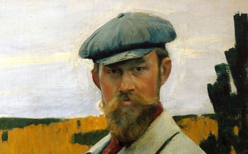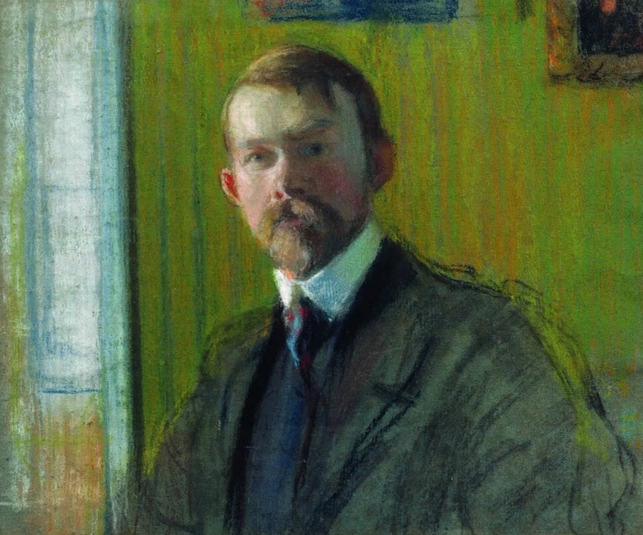 Кустодиев. Автопортрет. Начало 1900-х. Цвета играют от телесного до пепельного. Зелёный фон тоже весь в оттенках.