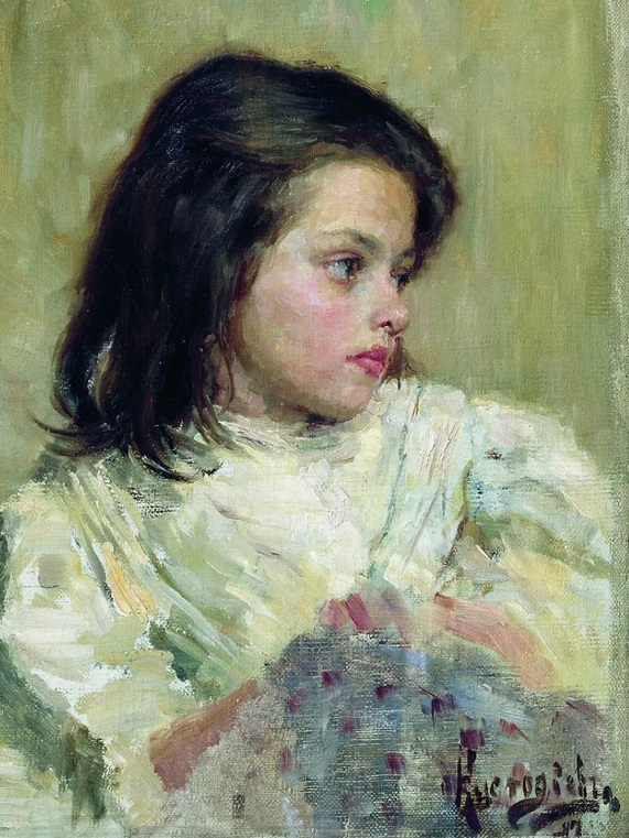 Кустодиев. Голова девочки. 1897. Тут – тоже. Больше не нашёл, но Кира Долинина права. А вот это смогу проследить? “… вялость в парадных портретах: там, где Репин был гением, Кустодиев оставался подмастерьем. Кустодиевская часть “Заседания Государственного совета” – лишь тень великого Репина, выбравшего себе в помощники не “иного”, а способного быть подобием мастера ученика” (Там же). “Ассистентами Репина были его ученики Иван Куликов и Борис Кустодиев. Первый писал левую часть картины, второй — правую. Репин взял на себя центр” (https://dzen.ru/a/ZMEeEL5dkyPDPsVS).