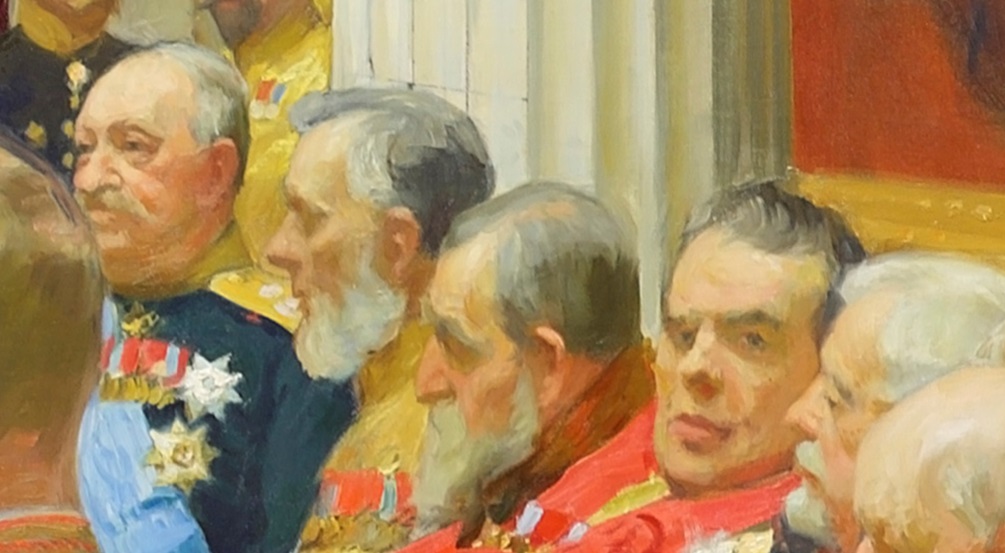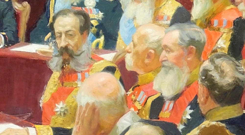 Репин. Торжественное заседание Государственного совета 7 мая 1901 года в честь столетнего юбилея со дня его учреждения. 1903. Кого ж сравнивать? Близко к центру и к Николаю Второму сидит человек к нам в три четверти оборота, чуть не бросающийся в глаза тем, что другие около него сидят к нам профилями и затылками. Его, наверно, писал Репин.